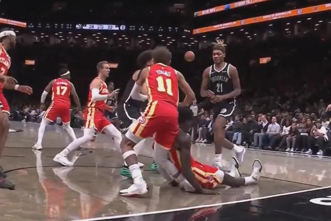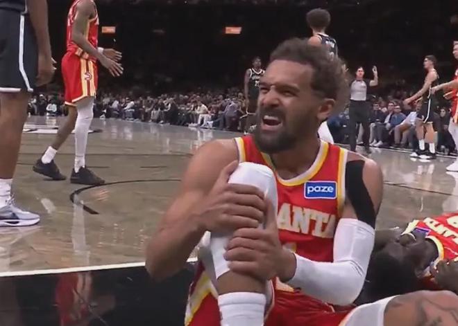 在第一節(jié)比賽里,特雷·楊就在一次防守中被摔倒的隊友壓到了自己的右側(cè)膝蓋。